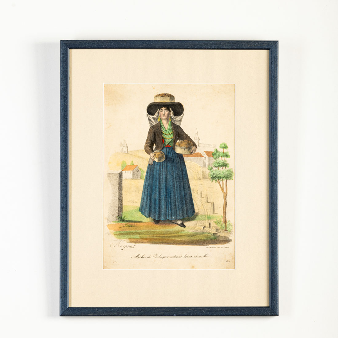 Litografia colorida sobre papel, datada de 1841, desenhada por João Macphail (1816?-1856) e impressa por Manuel Luiz da Costa (Lisboa). É de notar, por curiosidade, que o chapéu da vendedora é encimado por uma enorme broa. Pequenos defeitos. Dim: 27,5x19cm.