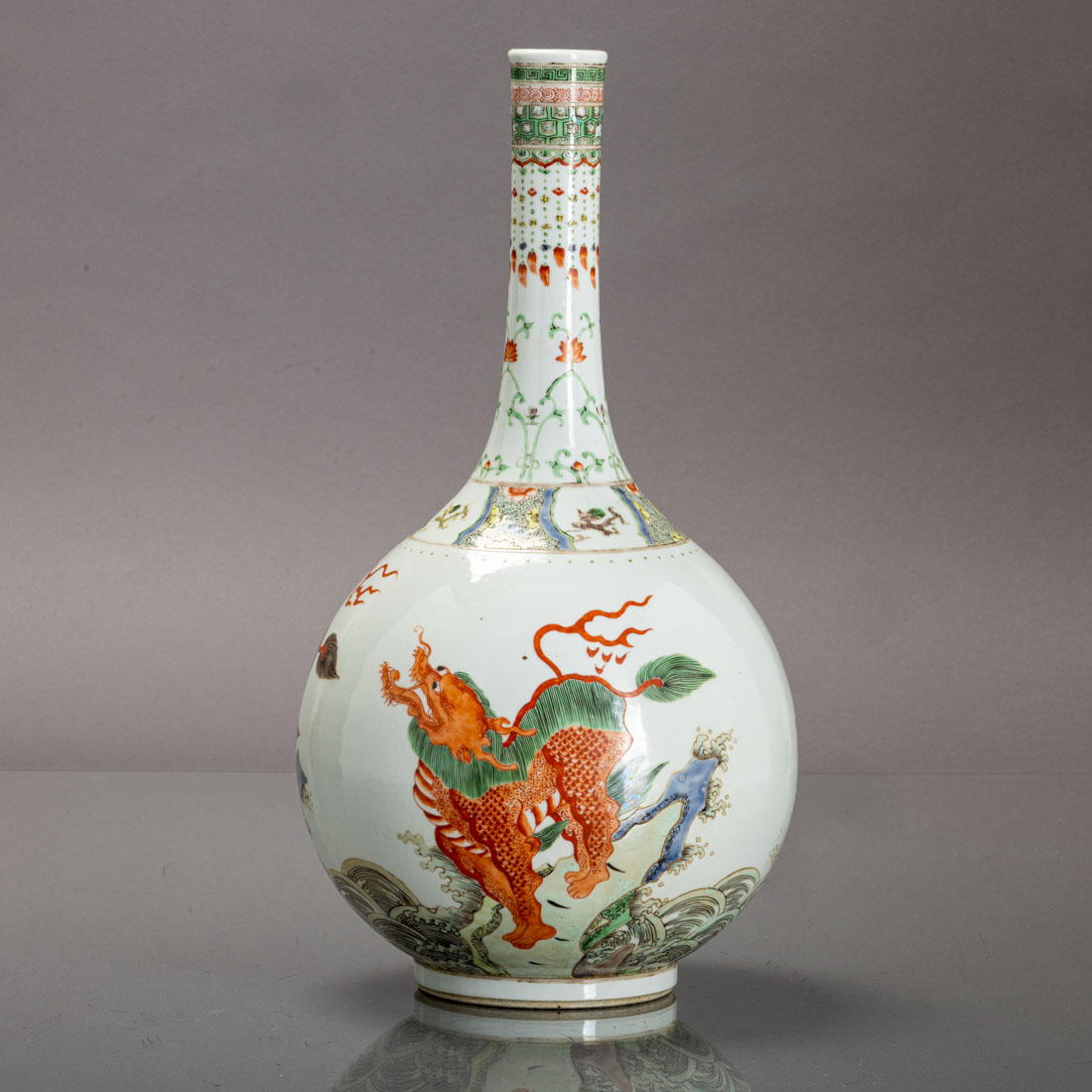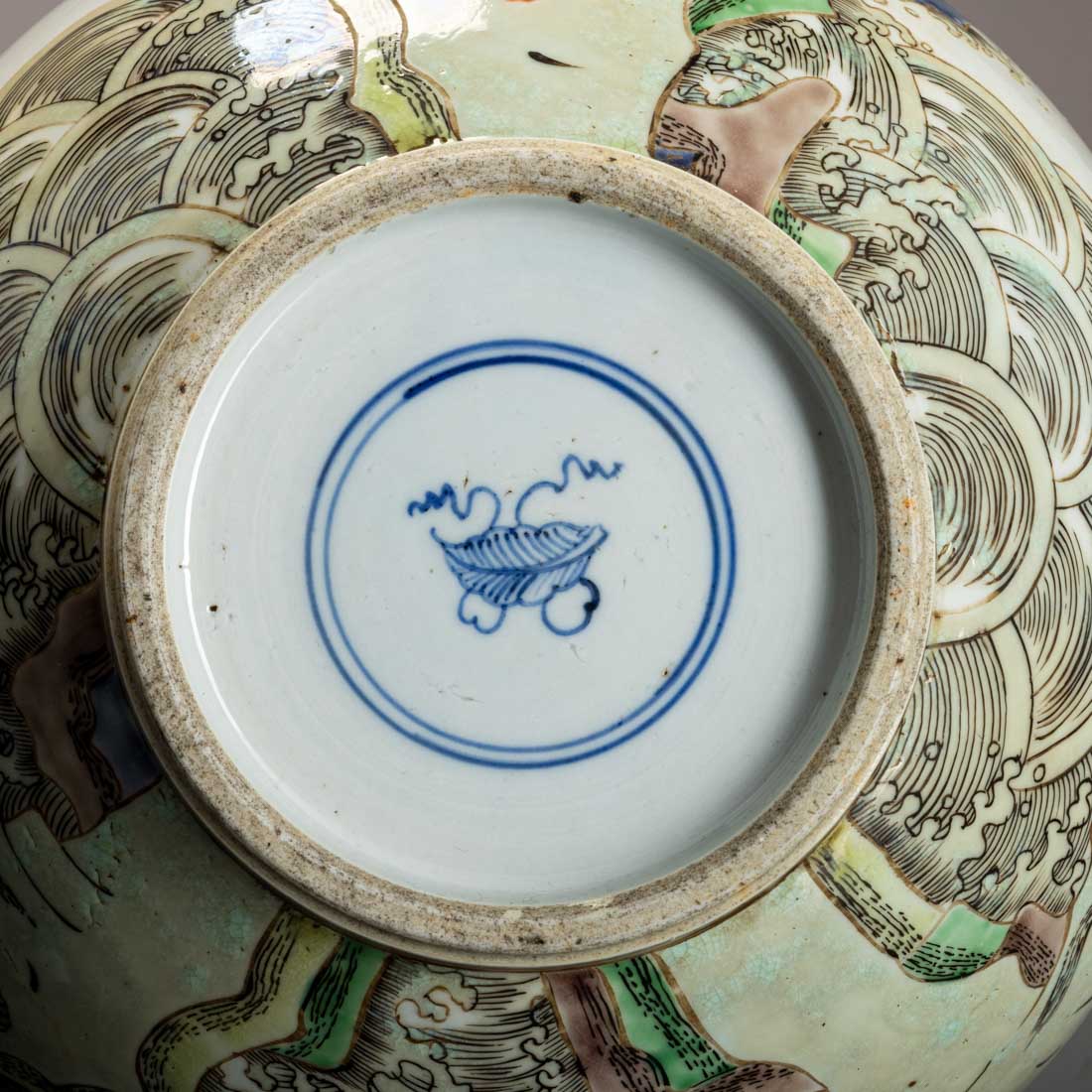 Em porcelana da China, decoração com esmaltes policromos da família verde "animais fantásticos e ondas". Marcada. Sinais de uso, ligeiro desgaste.