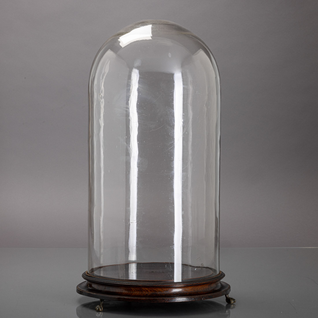 Em vidro, base em madeira escurecida, pés de garra em metal amarelo. Esbeiçadelas na base.