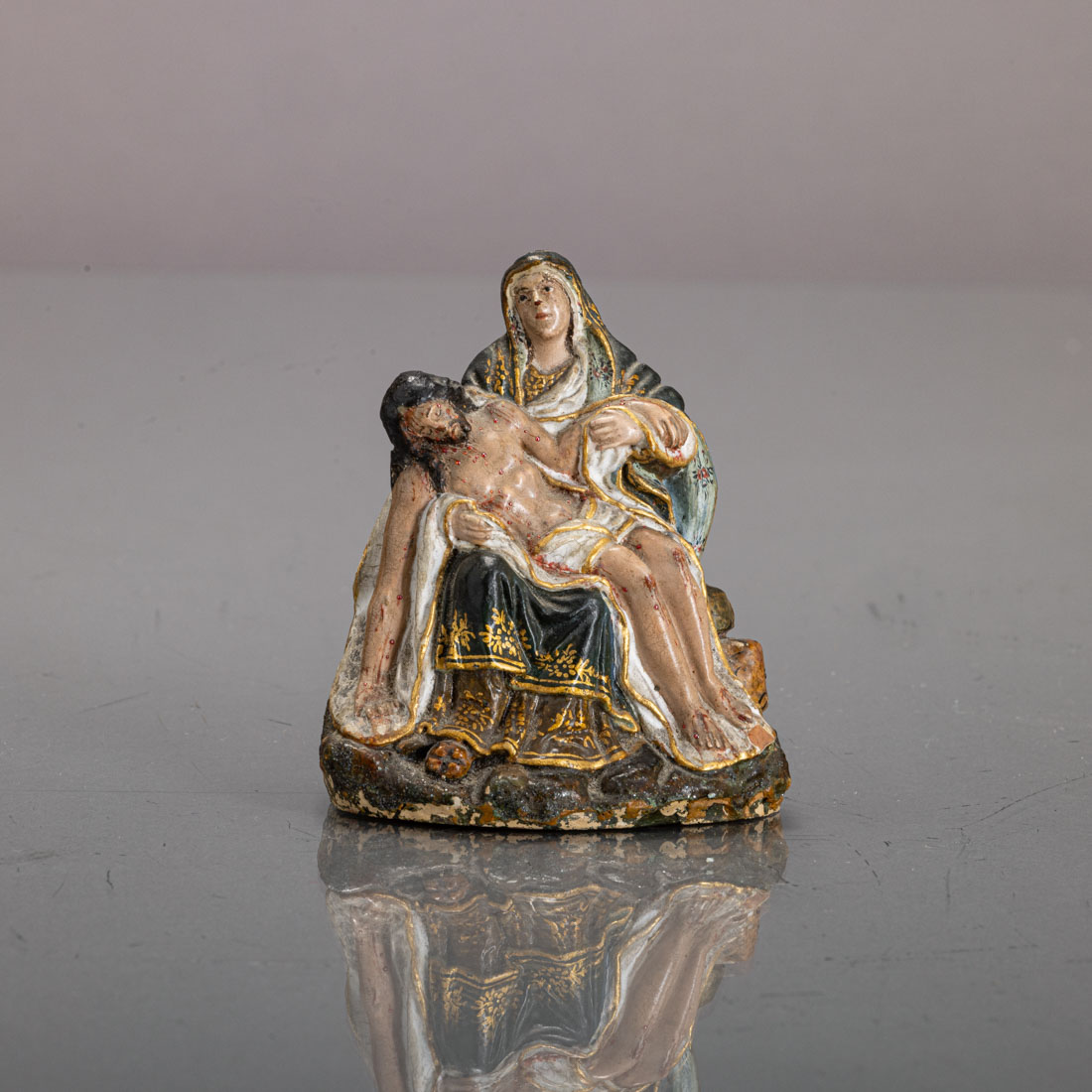 Grupo escultórico em terracota, decoração policromada e dourada. Pequeno restauro e pequenas falhas.
