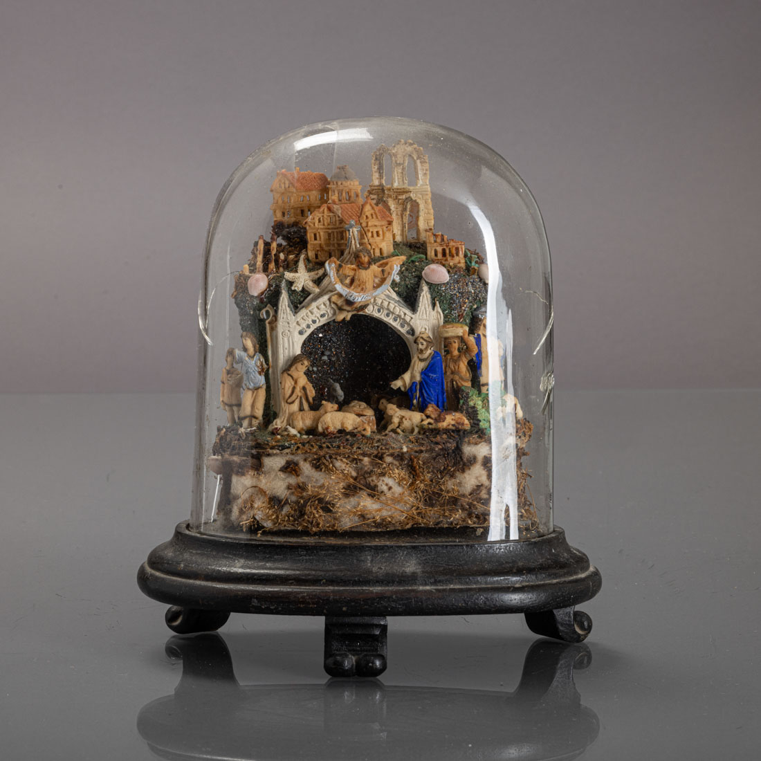 Grupo escultórico em material orgânico e outros materiais, decoração policromada. Redoma oval em vidro (partida), base em madeira escurecida. Falhas e defeitos.