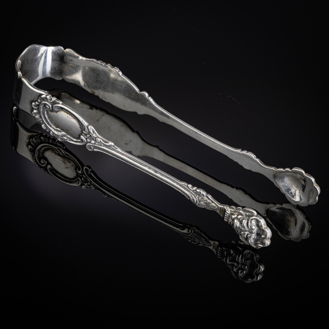 Em prata portuguesa contraste javali (1887-1937) de 833, decoração relevada com elementos vegetalistas e mascarões. Sinais de uso.
