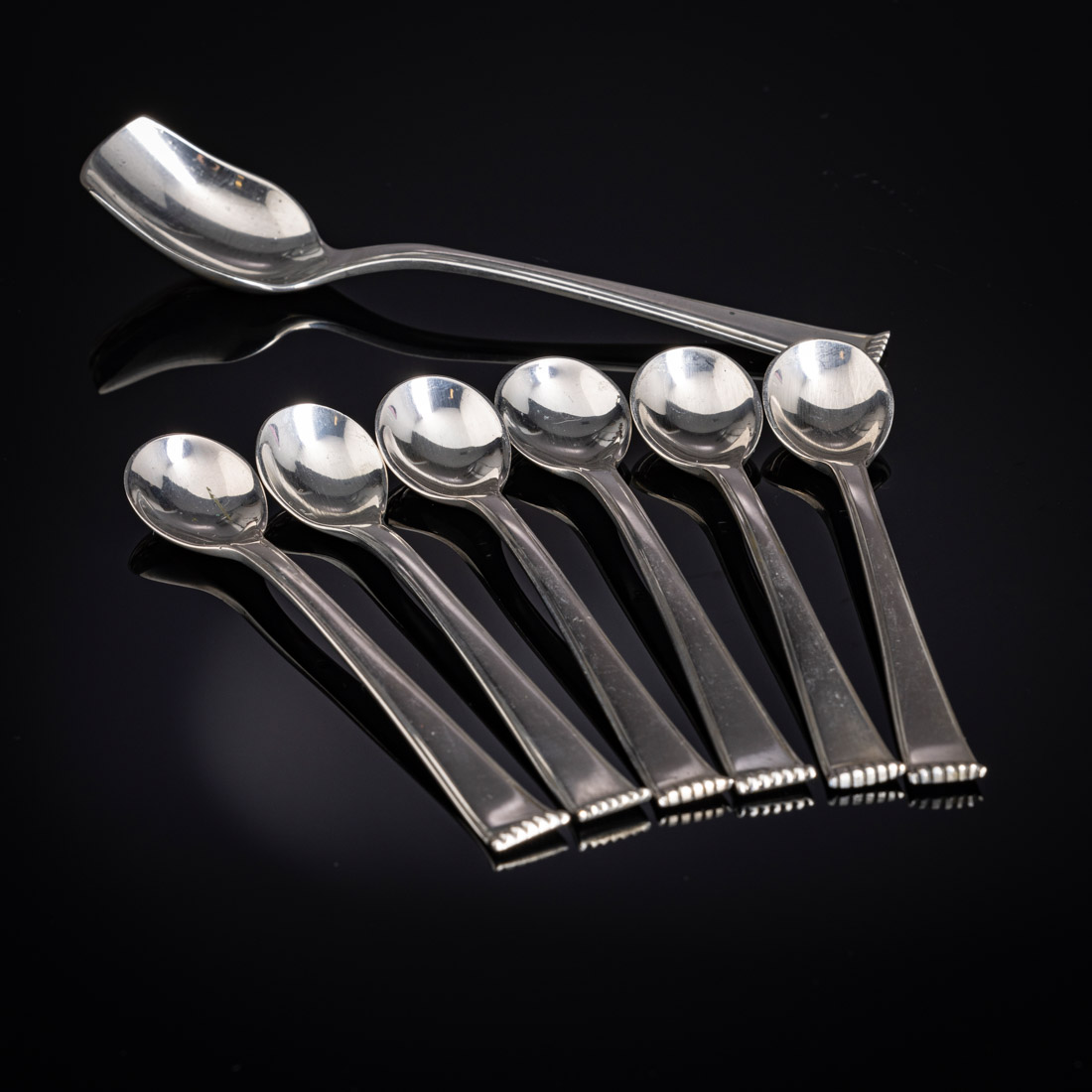 757. CONJUNTO DE SEIS COLHERES DE CAFÉ E CONCHA DE AÇÚCAR