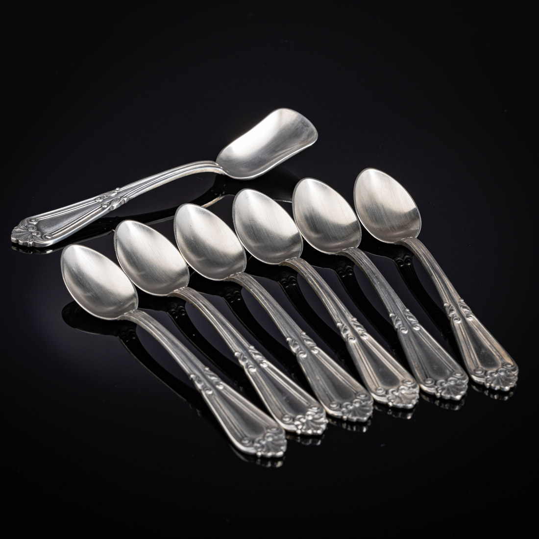 759. CONJUNTO DE SEIS COLHERES DE CAFÉ E CONCHA DE AÇÚCAR