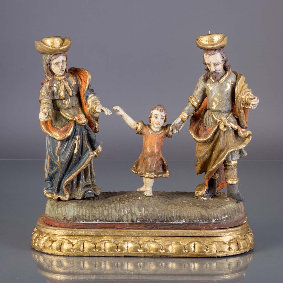 Grupo escultórico em madeira policromada e dourada, base com entalhamentos dourados. Pequenas falhas e defeitos, base com vestígios de xilófagos.