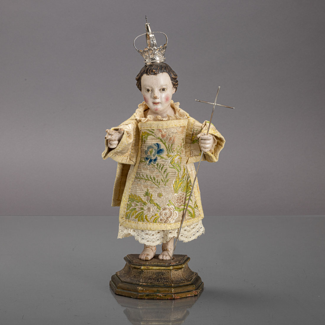 Escultura em madeira policromada. Vestes em seda bordada e algodão com rendas. Coroa e cruz em prata sem marcas, ao abrigo do D/L nº.120/2017. Base em madeira pintada. Séc. XVIII. Pequenas falhas e restauros.