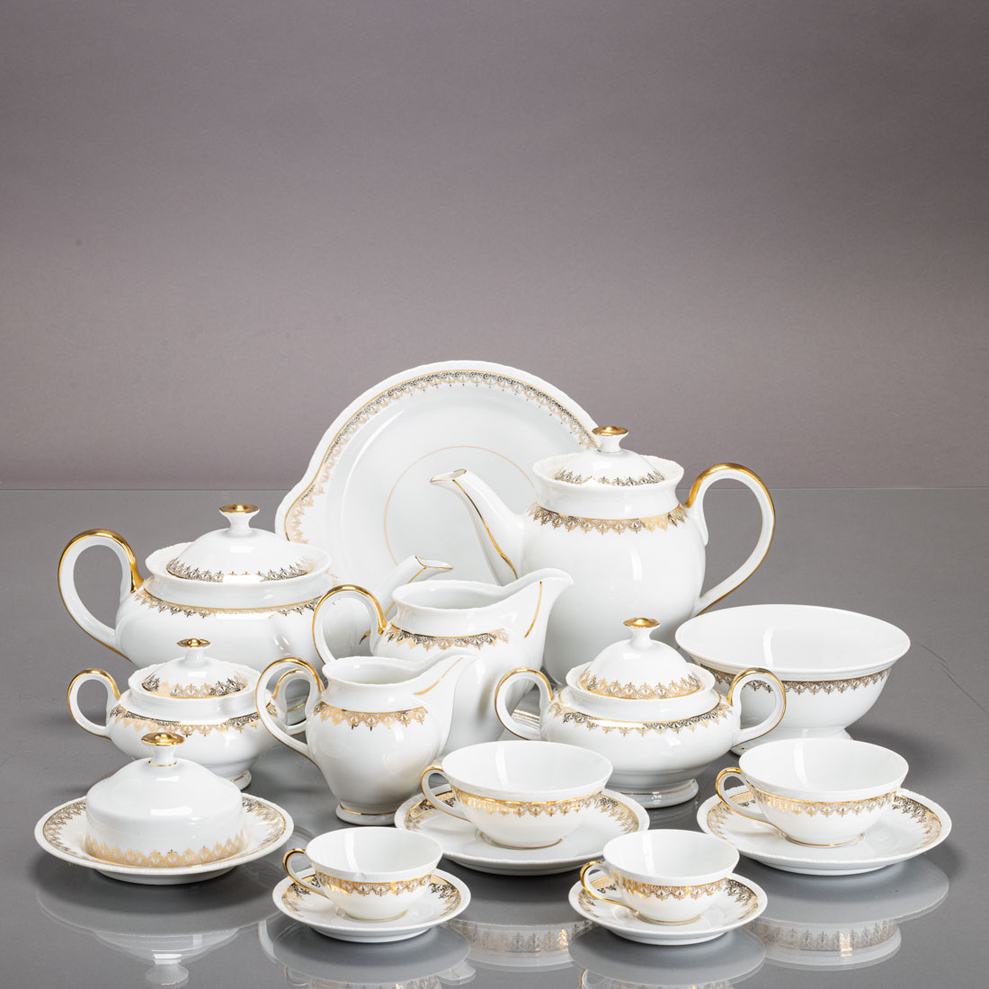 Em porcelana moldada (1947-1968) decoração a dourado, Composição: bule, cafeteira, 2 leiteiras, 2 açucareiros, manteigueira, taça de pingos, prato de torradas, 9 chávenas de chá com pires e 12 de café com pires. 2 chávenas de café e 1 de chá com esbeiçadelas