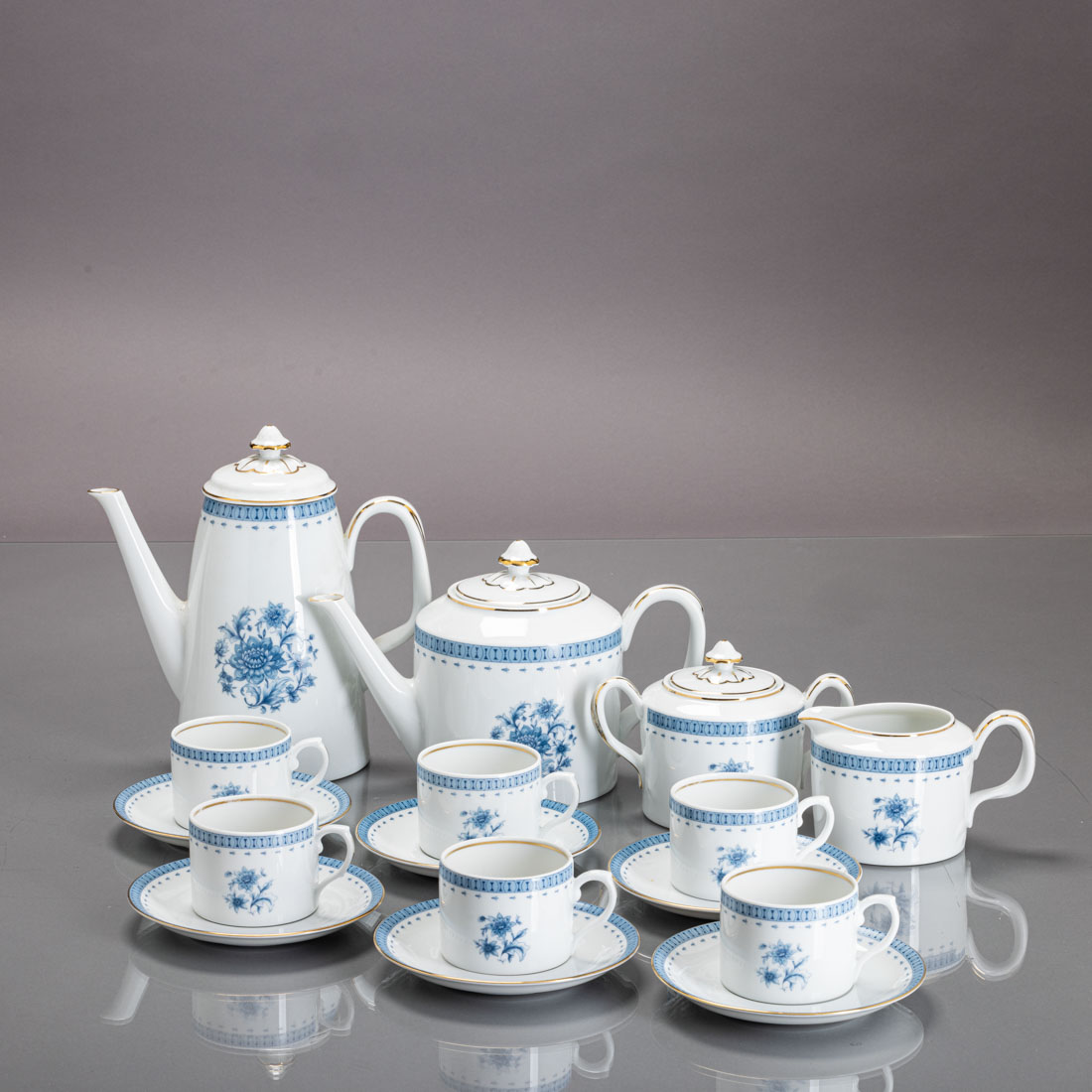 Em porcelana moldada (1980-1992), decoração a azul e dourado "flores". Composto por bule, leiteira, açucareiro e seis chávenas com pires, acompanha cafeteira. Sinais de uso.