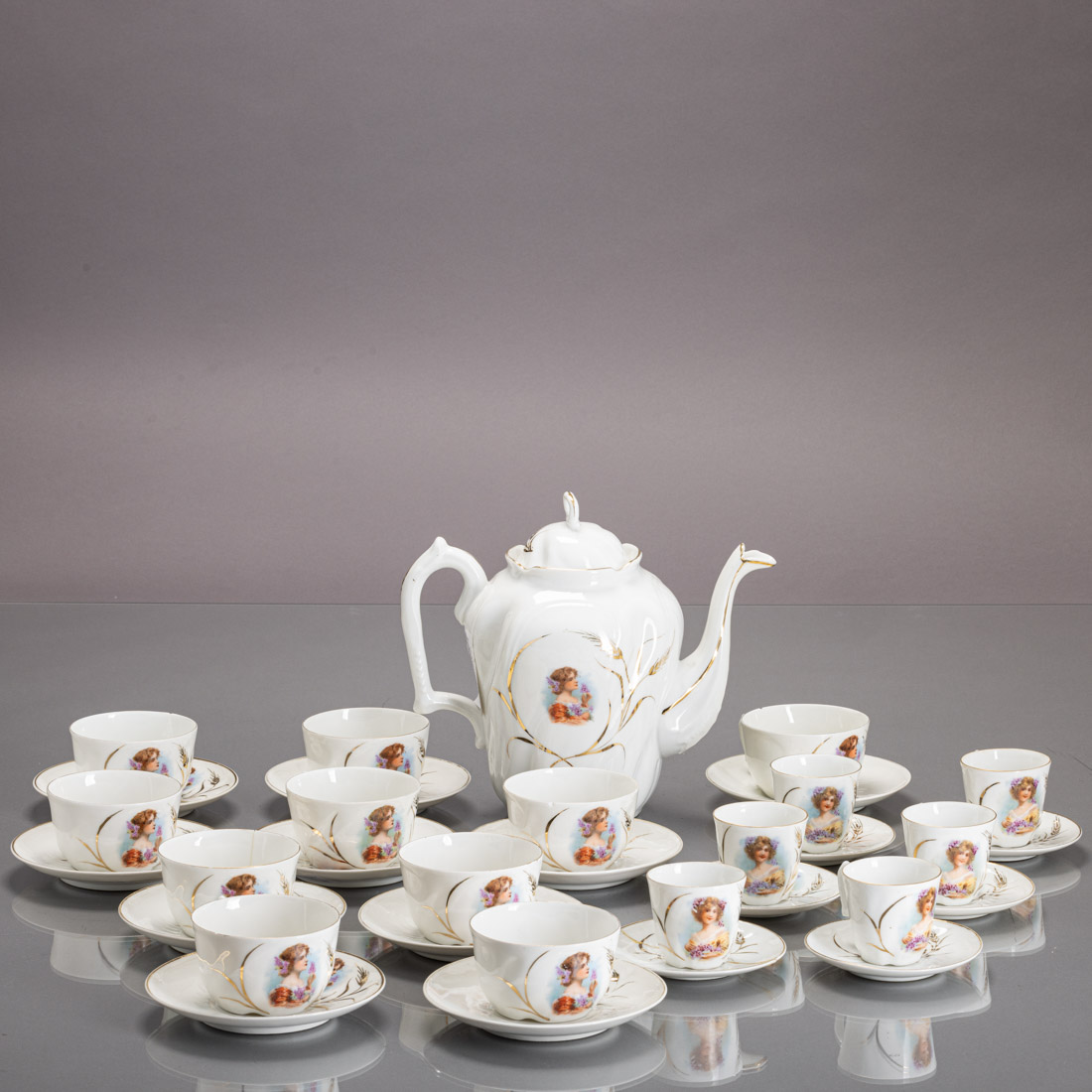 Em porcelana moldada (1881-1921), decoração policromada e dourada "busto feminino". Composto por cafeteira, leiteira, 10 chávenas de chá com pires e 5 de café com pires. Sinais de uso, 7 chávenas de chá com defeitos.