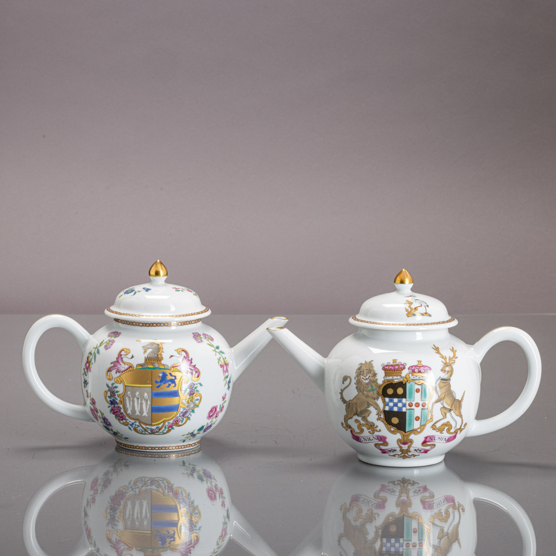 Em porcelana moldada, decoração policromada e dourada com brasão, "Arms of Pitt impalling Grenville" e "Arms of Kitson impalling Gregory". Edição Mottahedeh. Sinais de uso.