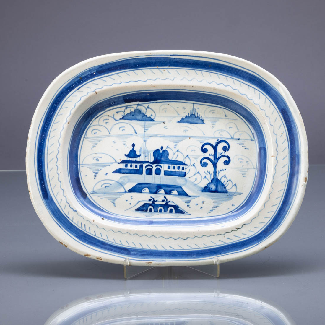 Em faiança portuguesa, decoração a azul "paisagem oriental com pagodes", possivelmente Miragaia, Séc. XIX. Desgaste no vidrado do bordo, craquelé.