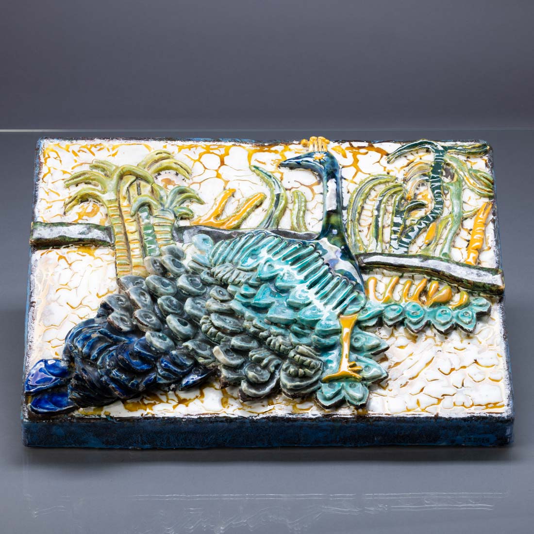 Placa em cerâmica vidrada, decoração relevada e policromada, assinada. Pequenas falhas.