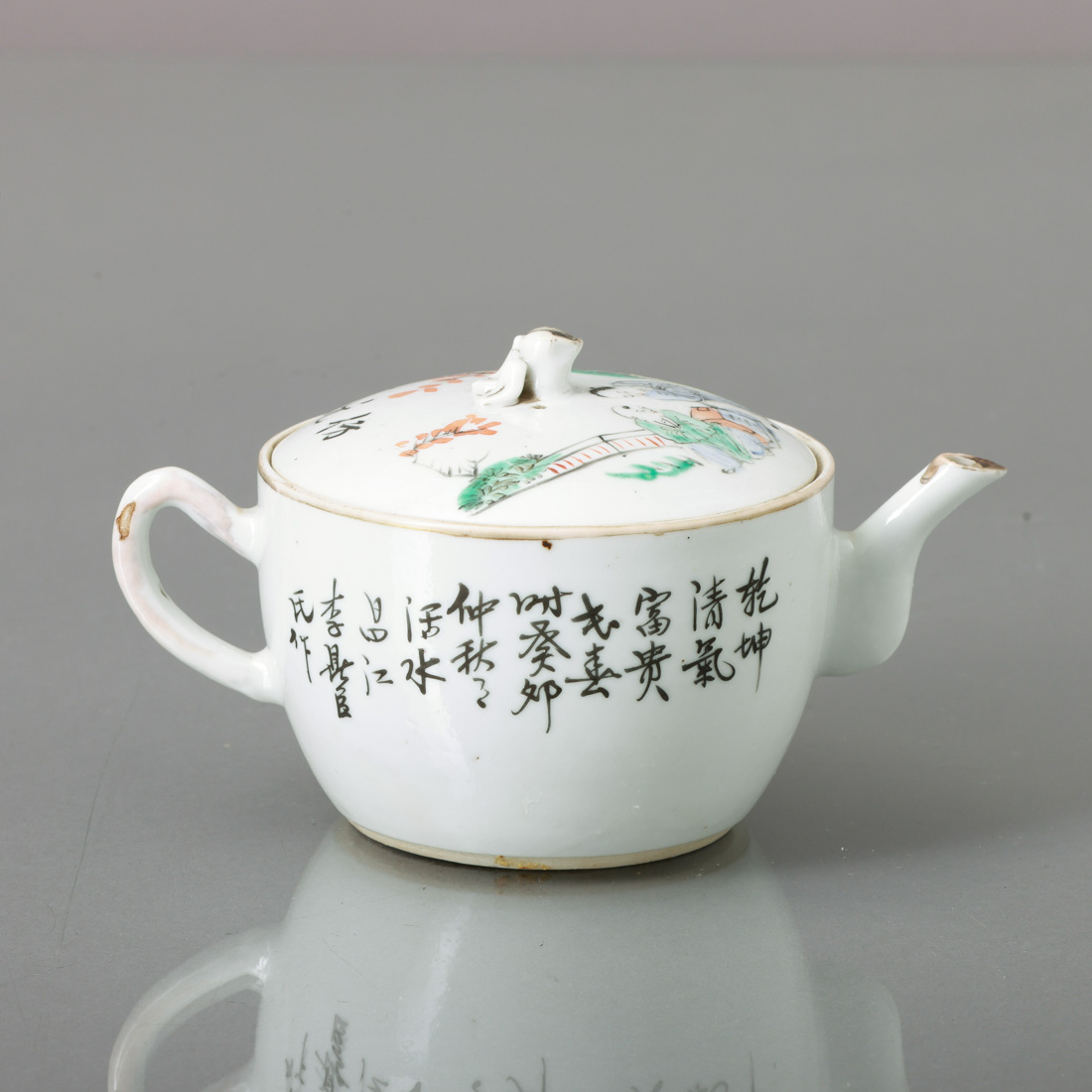 Em porcelana da China, decoração policromada com figuras orientais e caracteres. Marcada. Sinais de uso.