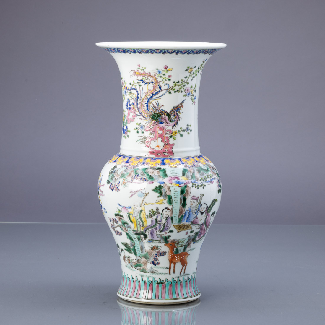 Em porcelana da China, decoração policromada "paisagem com figuras e animais". Marcada. Sinais de uso.