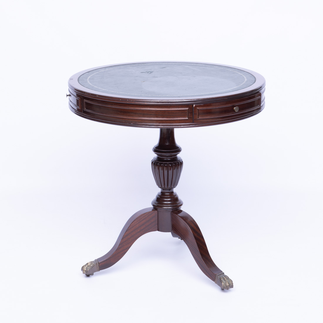 Em mogno, tampo redondo revestido a pele verde com duas pequenas gavetas, coluna central torneada, pés zoomórficos em metal, com rodízios. Pequenos defeitos.