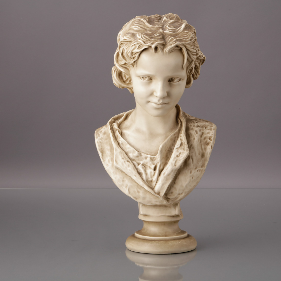 Escultura em cerâmica patinada, assinada e datada, na base etiqueta "Decorativa - Coimbra". Séc. XX. Sinais de uso.