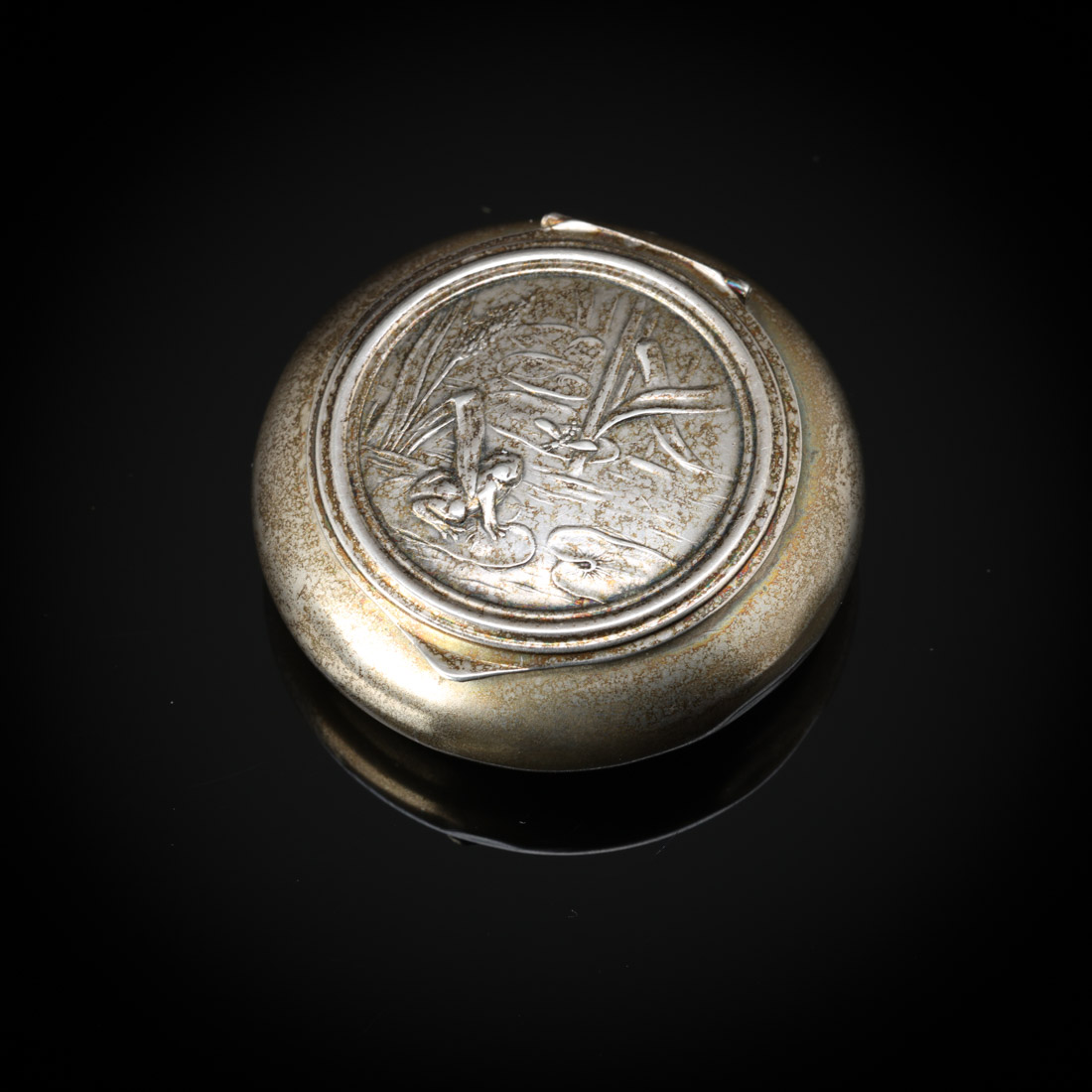 Em prata portuguesa contraste javali (1887-1937) de 833, decoração relevada "lago com sapo". Pequenas amolgadelas.