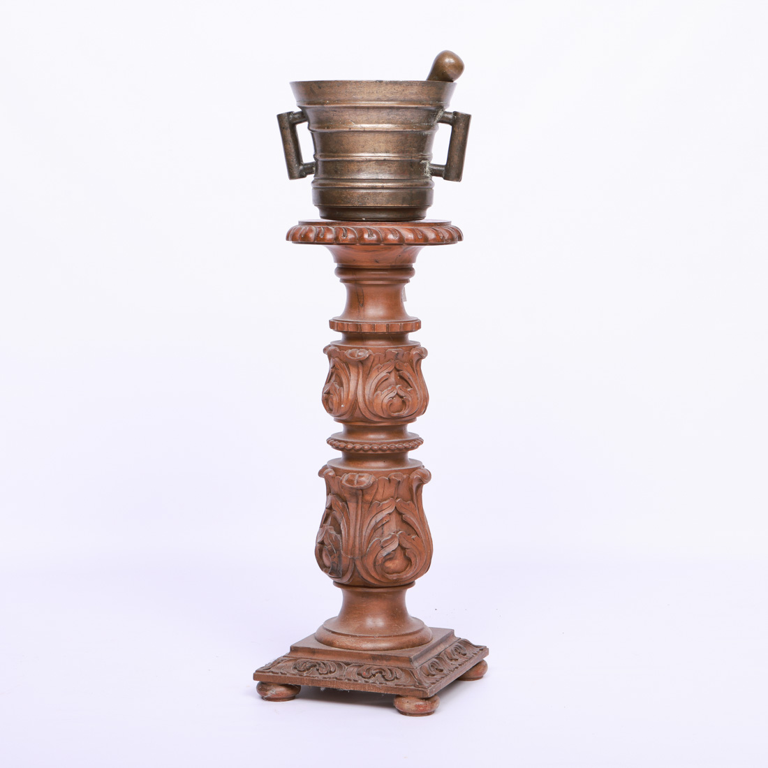 Em bronze relevado com duas pegas. Acompanha coluna em castanho com entalhamentos vegetalistas. Almofariz com amolgadelas, coluna com pequena falhas e vestígios xilófagos.