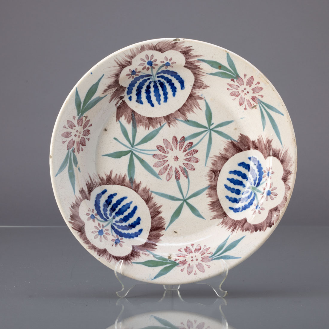 Em faiança portuguesa decoração a azul, verde e vinoso "flores". Séc. XIX/XX. Pequena esbeiçadela, sinais de uso..