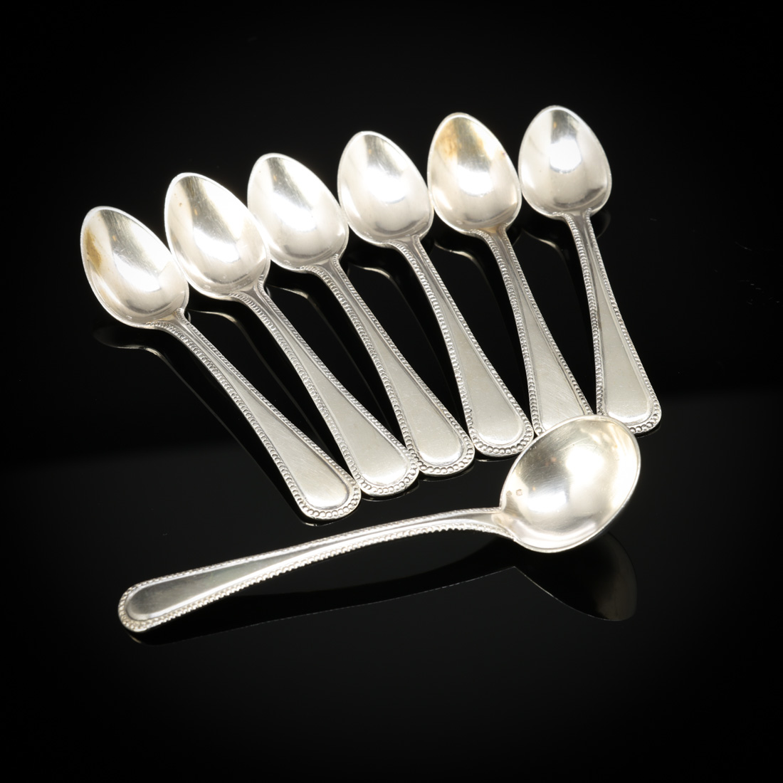526. CONJUNTO DE SEIS COLHERES DE CAFÉ E CONCHA DE AÇÚCAR