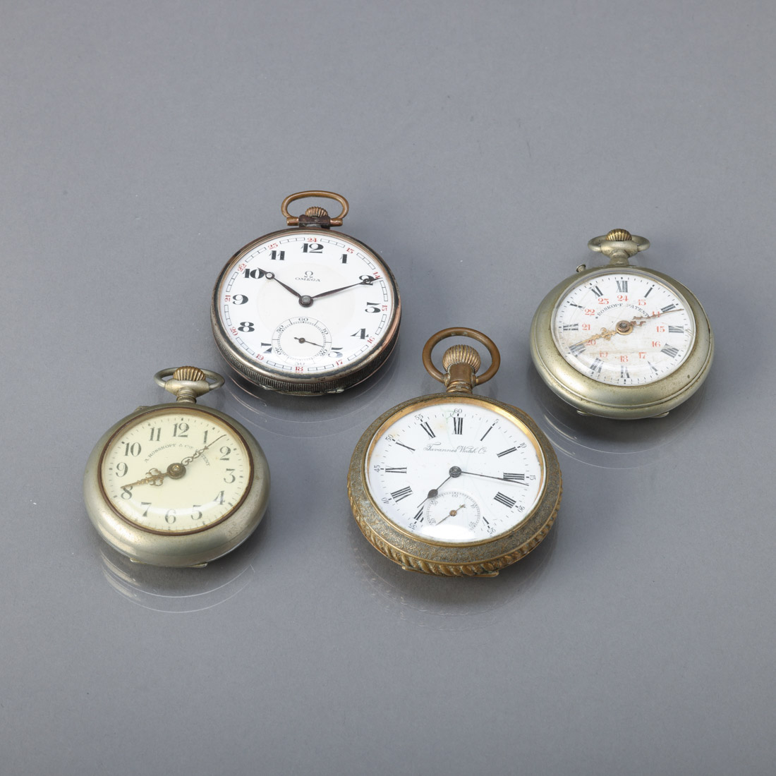 Caixas em metal, das marcas Omega, Roskopf e Tavannes, movimento mecânico de corda. Mecanismos a necessitarem de revisão. Dois com defeitos no mostrador, pequenos defeitos.