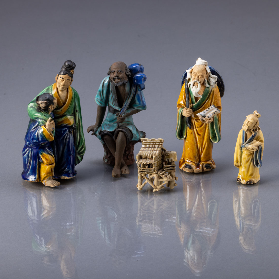 630. QUATRO FIGURAS ORIENTAIS E CASA MINIATURA