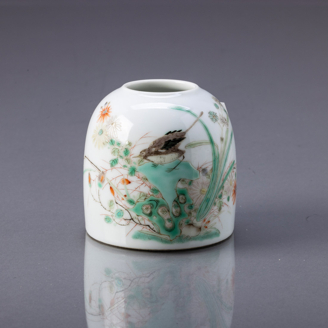 Em porcelana da China, decoração policromada "flores, pássaro e insectos". Marcada. Sinais de uso.