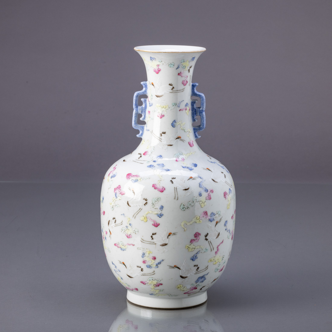 Em porcelana da China, decoração policromada "garças entre nuvens", asas relevadas. Marcada. Desgaste no bordo.
