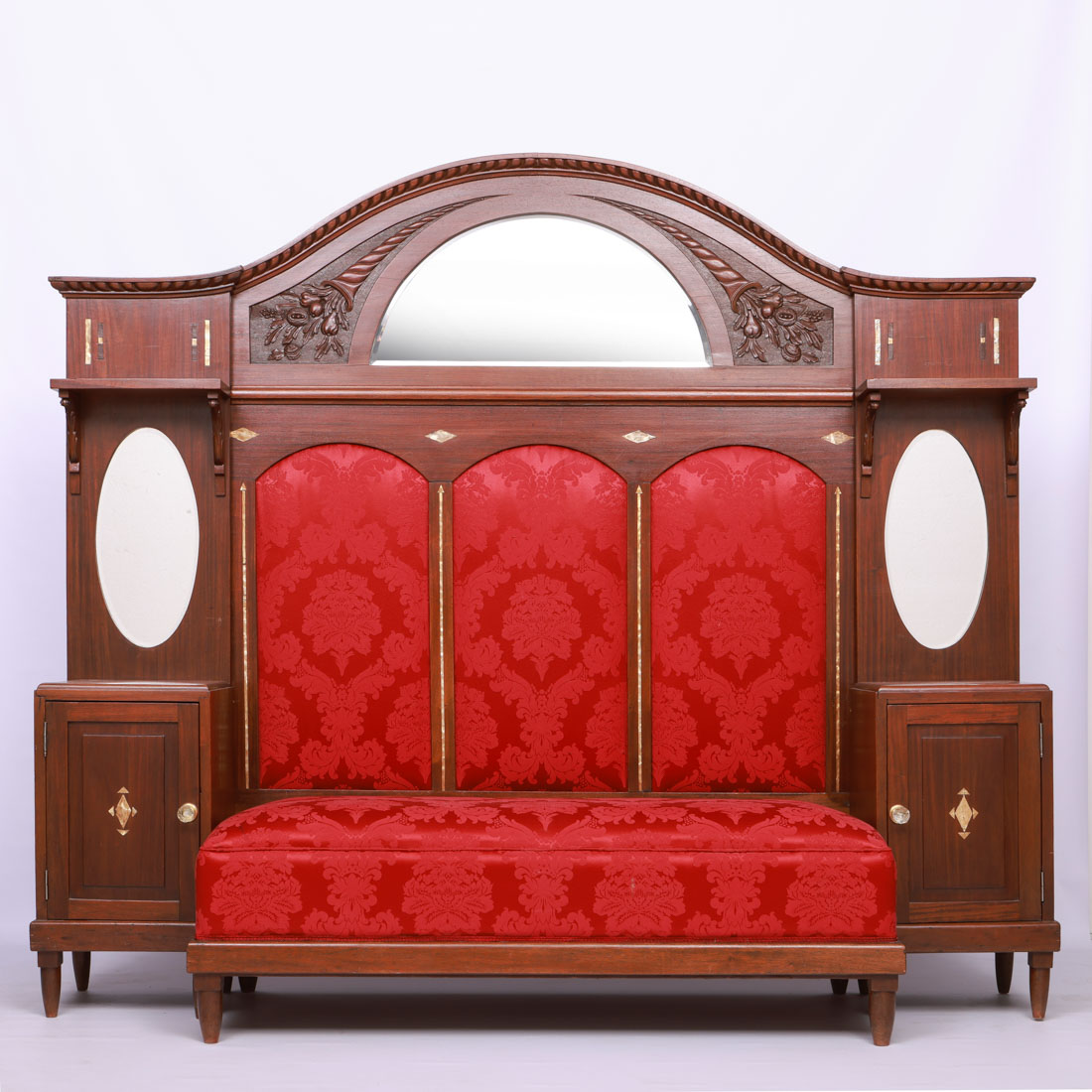 Em mogno com entalhamentos e espelhos, com dois pequenos armários laterais, assento e costas estofados a damasco. Pequenos defeitos.