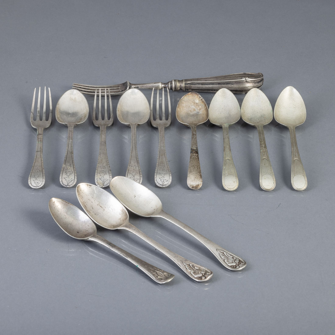 Em prata portuguesa do Séc. XVIII/XIX, com diferentes marcas de ourives e ensaiadores, decoração diversa, um garfo "cabo de pistola". Pequenos defeitos.