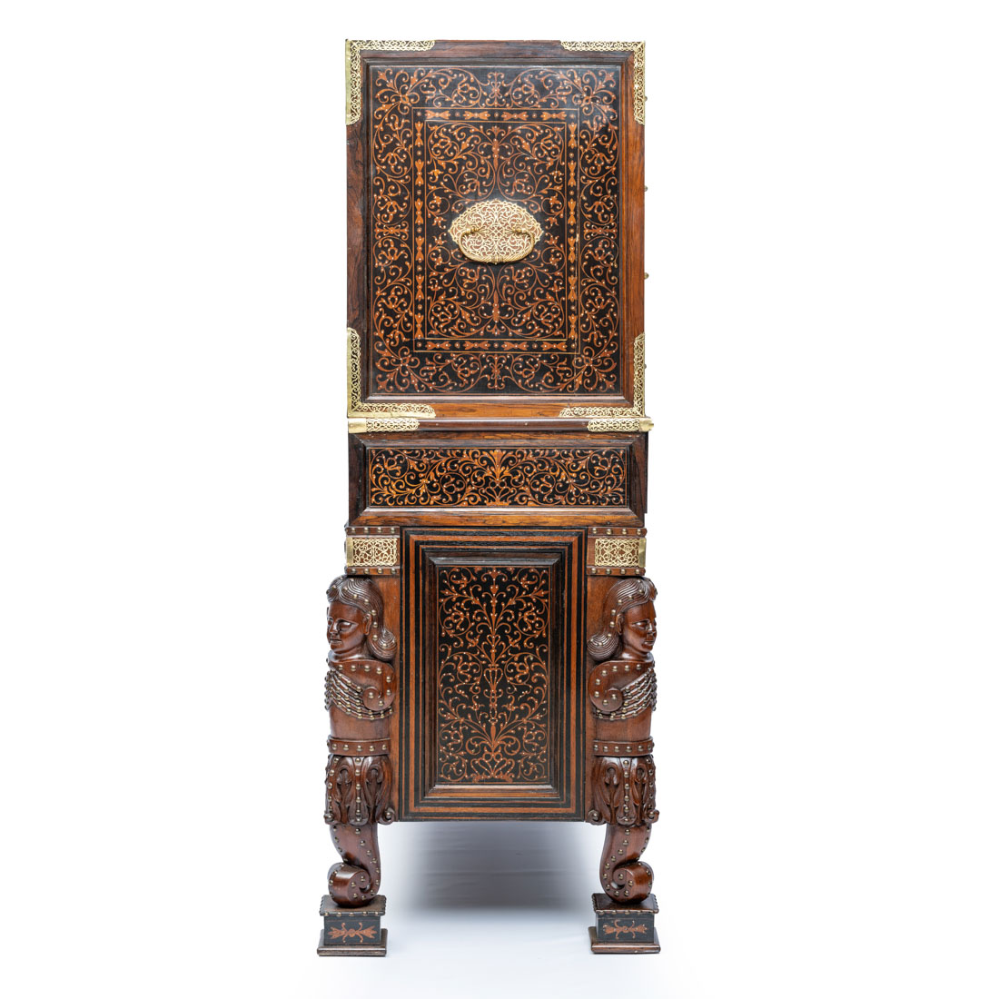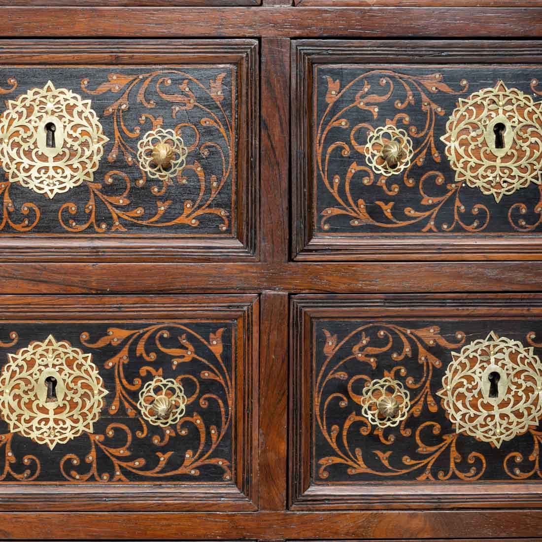Vertente Indo-portuguesa, Séc. XIX/XX, em pau santo, carvalho e castanho. Caixa com doze gavetas simulando dezasseis. Trempe com duas gavetas e dois gavetões. Pernas em forma de nagas. Decoração embutida com enrolamentos vegetalistas. Ferragens rendilhadas, Restauros e sinais de uso.