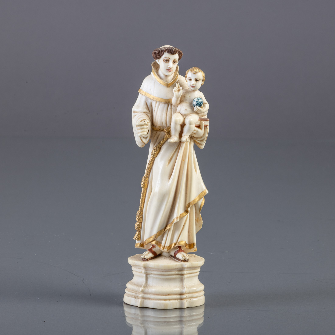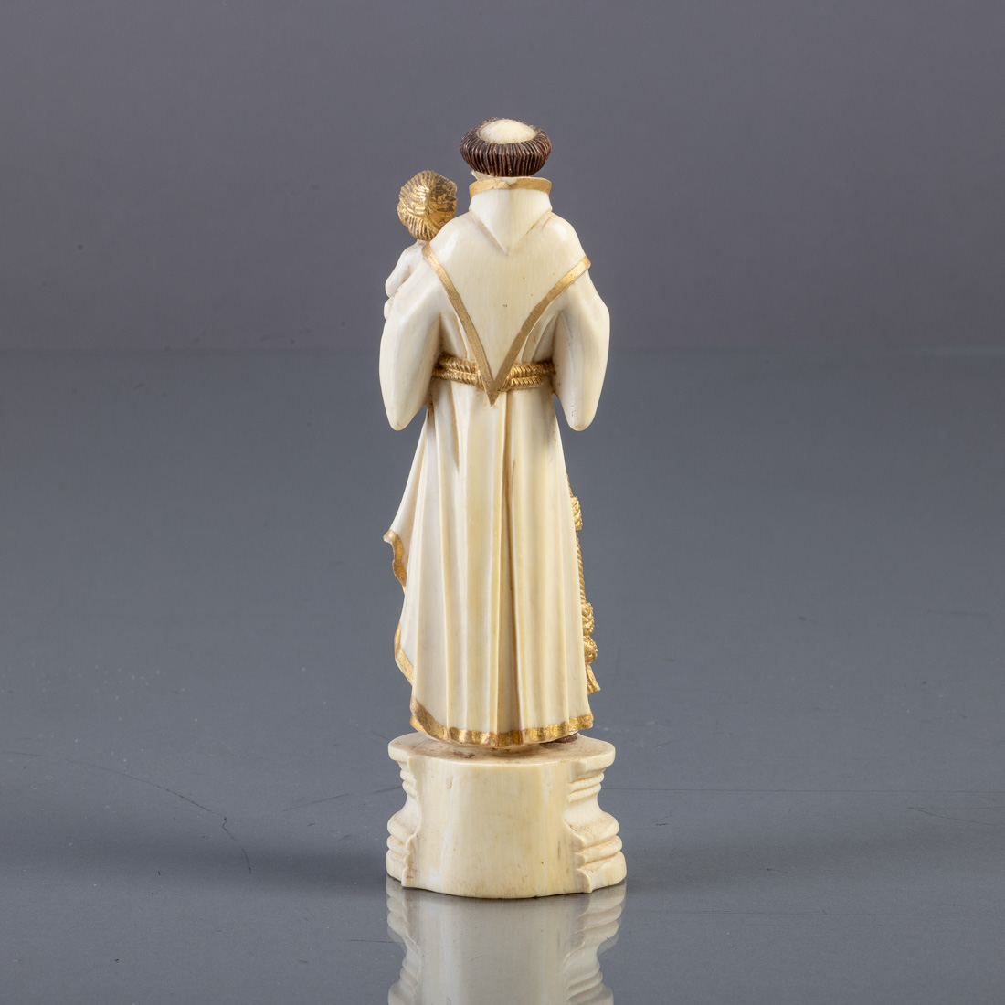 Escultura em marfim parcialmente dourada e policromada. Indo-portuguesa, Séc. XVIII. Sinais de uso.