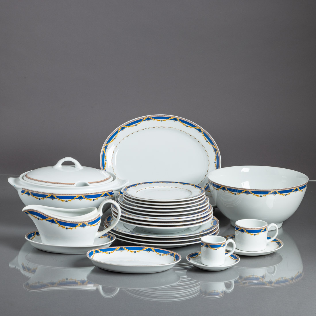 Em porcelana moldada (1992-1997), decoração policromada com grinaldas "Colecção Margarida". Composto por 24 pratos rasos, 12 de fundos, 12 de sobremesa, 12 de doce, terrina, 5 travessas, 2 conserveiras, saladeira, molheira com apresentador, 12 chávenas dechá e 12 de café com pires. Sinais de uso.