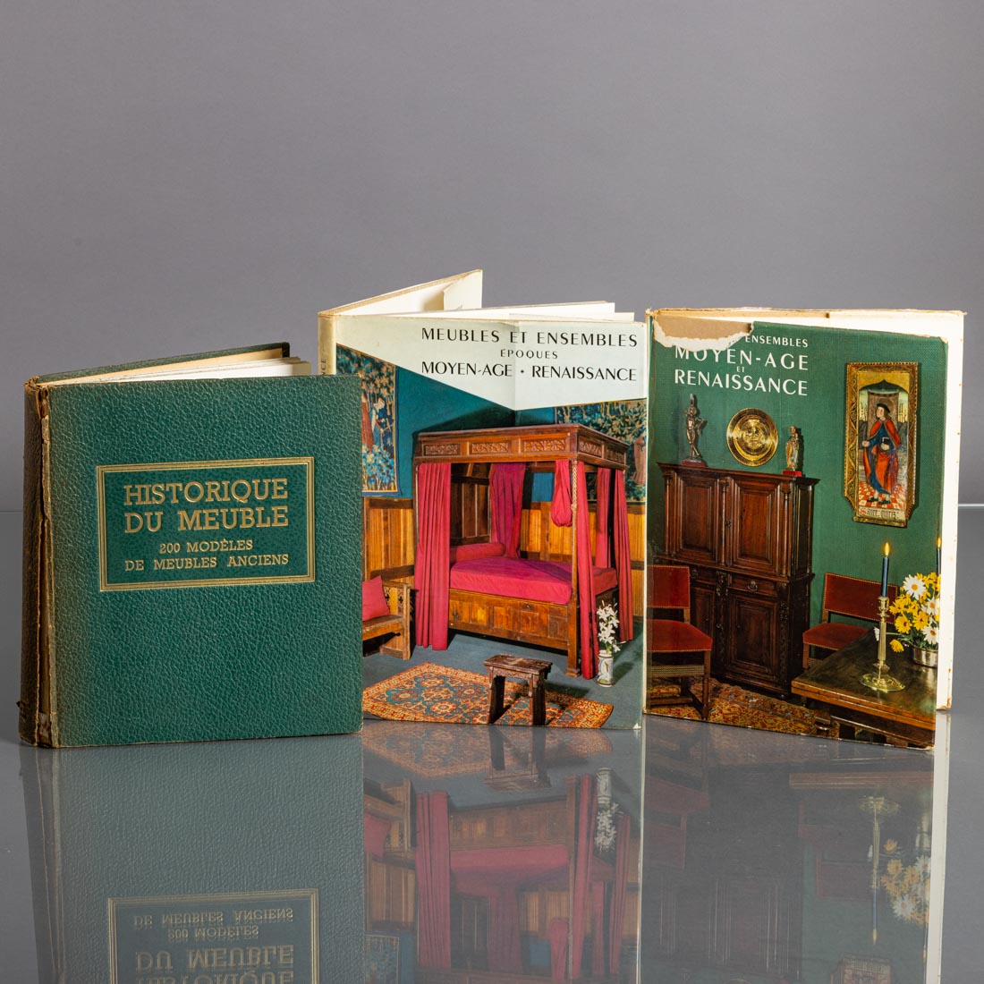 Livros profusamente ilustrados. "Meubles et ensembles époque moyen-age - renaissance", "Historique du meuble - 200 modéles de meubles anciens" e "Meubles et ensembles moyen-age et renaissance". Sinais de uso e defeitos.