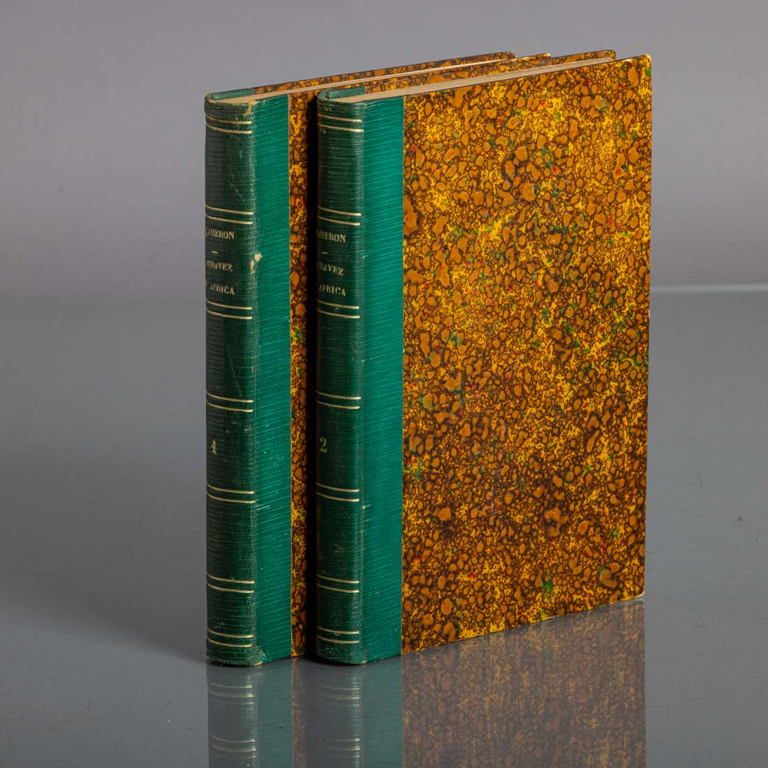 Volume I e II, obra ilustrada com muitas gravuras intercaladas no texto e algumas páginas de V. L. Cameron traduzida do inglez por Francisco de Lencastre. Lisboa 1879-1880. Meia encadernação em pele com ferros a ouro. Sinais de uso e pequenos defeitos.