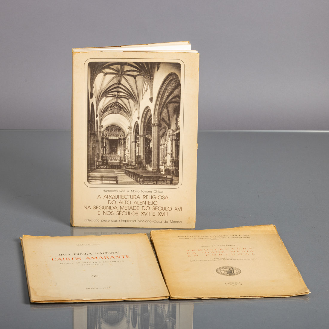 "A arquitectura religiosa do Alto Alentejo na segunda metade do século XVI e nos séculos XVII e XVIII" por Humberto Reis e Mário Tavares Chicó , "Uma figura nacional Carlos Amarante insigne arquitecto e engenheiro 1748-1815" por Alberto Feio e "Arquitectura da idade média em Portugal" por Mário Tavares Chicó. Em brochura. Falhas e defeitos.