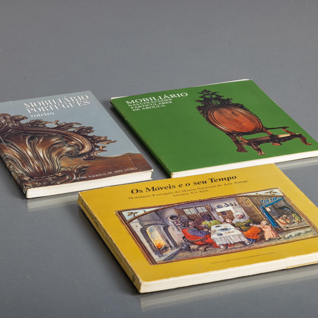 Profusamente ilustrados. "Mobiliário nas colecções particulares de Arouca", "Os Móveis e o seu Tempo - Mobiliário Português do Museu Nacional de arte antiga séculos XV-XIX" e "Mobiliário português - Roteiro". Sinais de uso e pequenos defeitos.