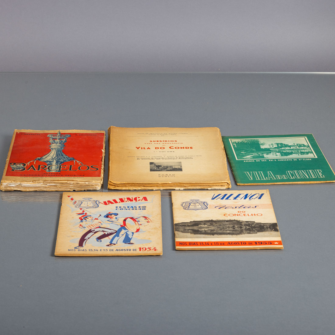 "Azenha do séc. XVI e convento de Sta. Clara - Vila do Conde", "Valença - Festas do Concelho" dos anos 1954 e 1955, "Barcelos resenha Histórica-Pitoresca-Artística" e "Subsídios para uma monografia de Vila do Conde" 1º Vol. Em brochura. Pequena falhas e defeitos.