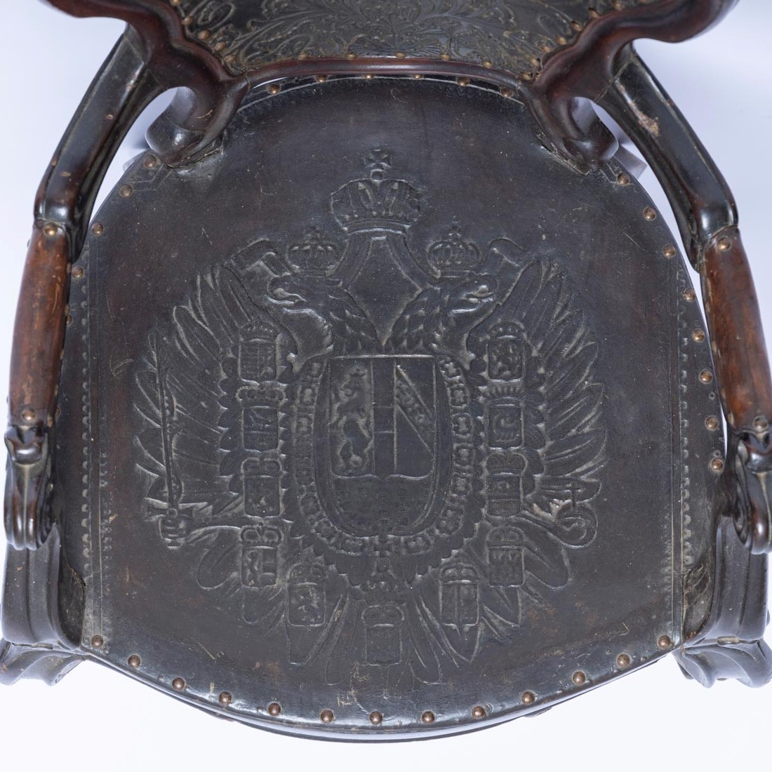 Em diferentes madeiras escurecidas com entalhamentos, assento e costas em couro lavrado "brasão de armas europeu" e "monograma" com pregaria. Séc. XIX. Pequenas falhas, defeitos e restauros