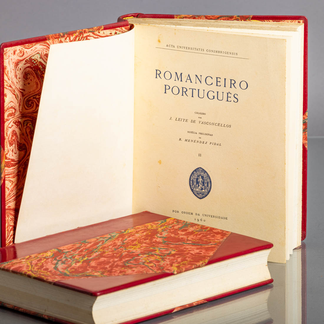 Em dois volumes, Acta Universitatis Conimbrigensis, coligido por J. Leite de Vasconcelos noticia preliminar de R. Menéndez Pidal. Por ordem da Universidade Vol. I 1958 e Vol. II 1960. Meia encadernação em pele com ferros a ouro. Sinais de uso e picos de humidade.