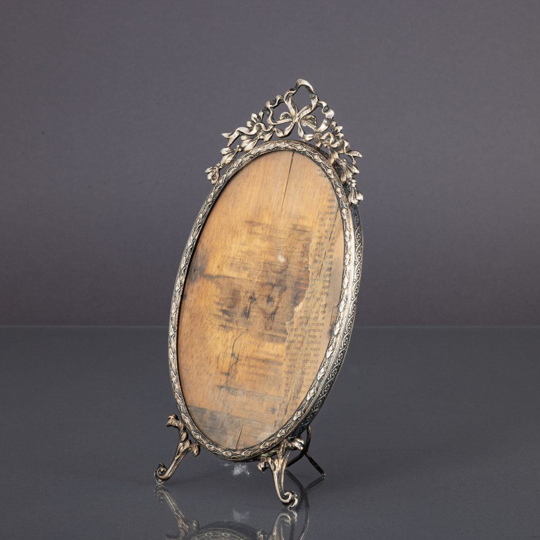 Em prata portuguesa contraste javali (1887-1937) de 833, decoração relevada com elementos vegetalistas encimado por laço. Sinais de uso.