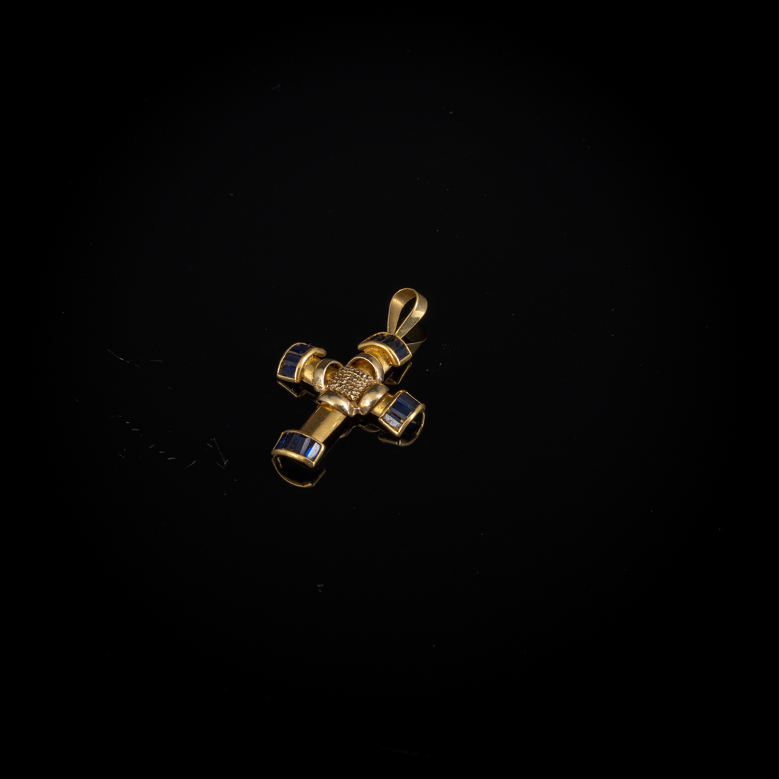 Em ouro de 19,2Kt., cravejado com safiras talhe baguette, decoração relevada. Sem marcas, ao abrigo do Decreto-Lei n.º 120/2017. Pequenos defeitos, levemente amolgada.