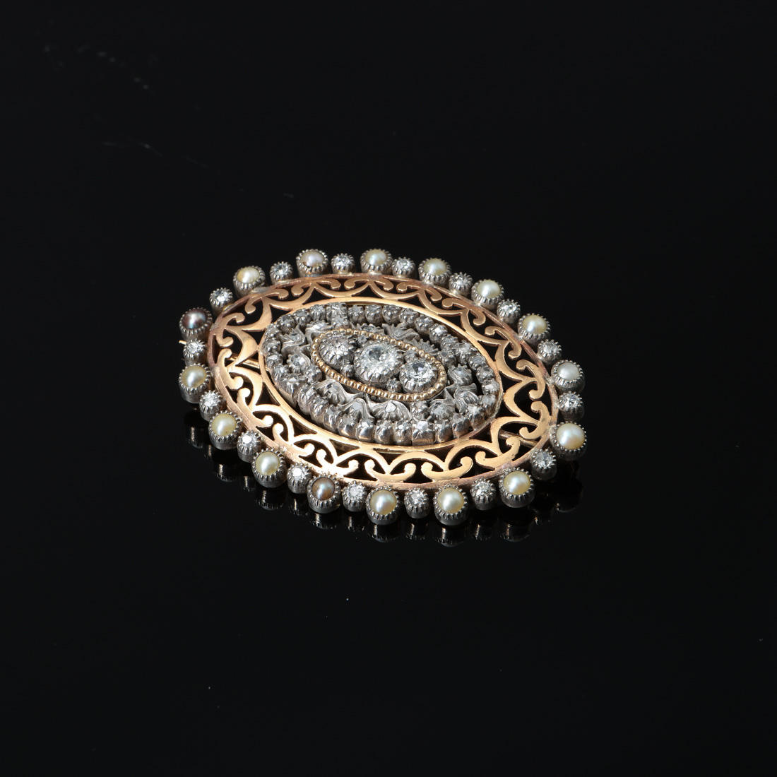Em ouro e prata, cravejado com diamantes talhe brilhante e rosa com pérolas naturais. Sem marcas, ao abrigo do Decreto-Lei n.º 120/2017. Pequenos defeitos.