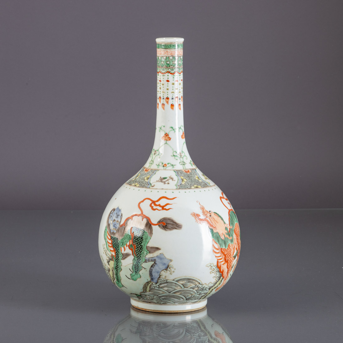 Em porcelana da China, decoração com esmaltes policromos da família verde "cães de foo sobre ondas". Marcada. Sinais de uso.