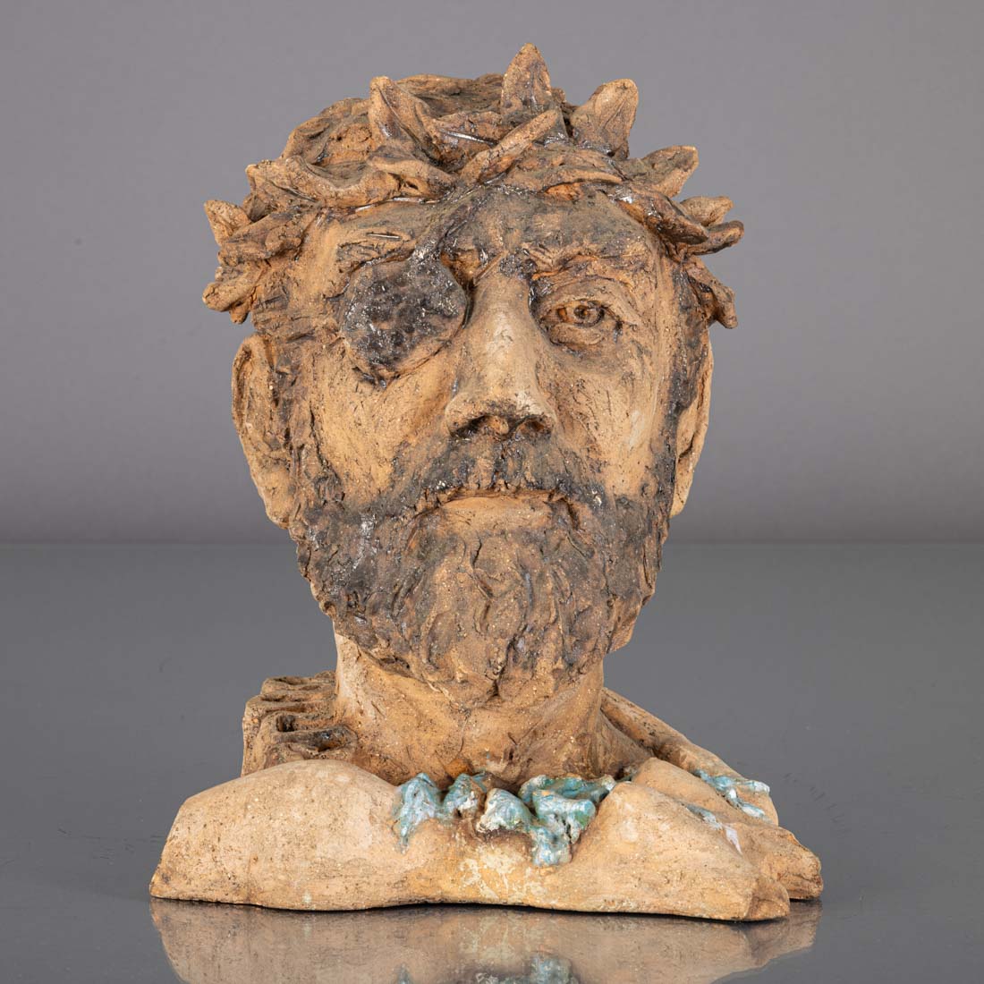 Escultura em terracota, parcialmente policromada, assinada. Pequenas falhas.