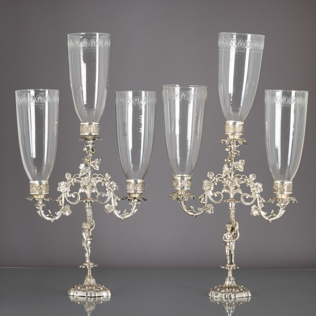 Em metal prateado decoração relevada e vazada com elementos vegetalistas, fustes "putti", verrines em vidro com gravados. Sinais de uso.