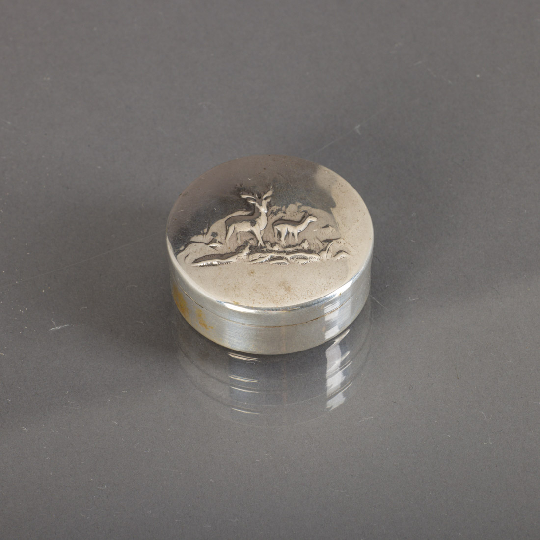 Em prata portuguesa contraste águia (pós 1985) de 835, tampa relevada decorada com veados. Sinais de uso.