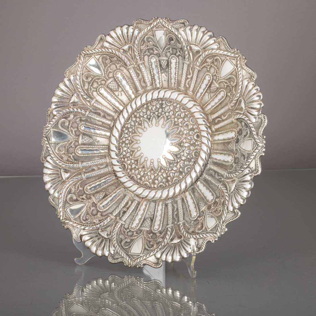 Em prata portuguesa contraste javali (1887-1937) de 833, decoração relevada com elementos neogóticos e vegetalistas. Sinais de uso.