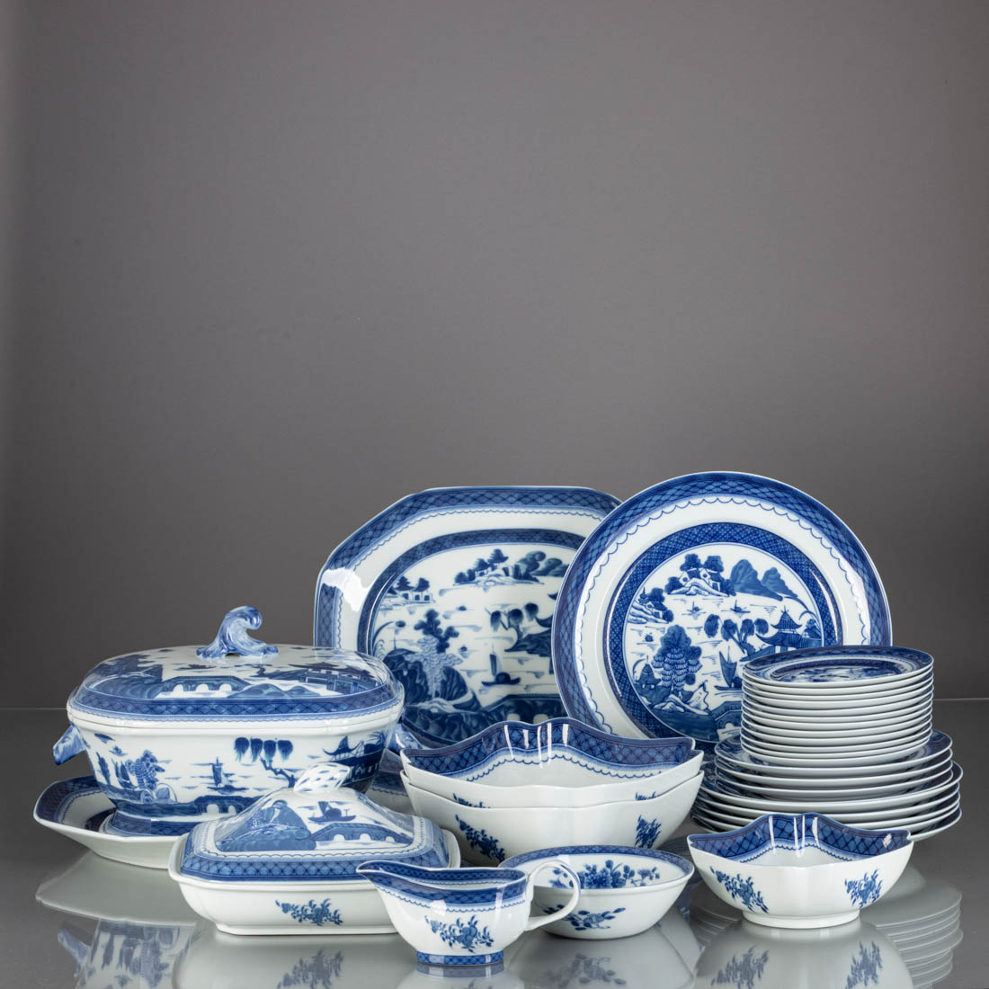 Em porcelana moldada (1980-1992), decoração a azul com paisagem e pagodes "Blue Canton". Edição Mottahedeh. Composto por 24 pratos rasos, 12 de fundos, 12 de sobremesa, 12 de doce, terrina, 2 travessas, prato de servir, prato coberto, 2 saladeiras, 2 saladeiras pequenas, 2 taças e 2 molheiras. Sinais de uso.