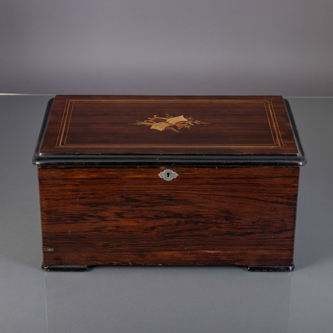 Caixa em nogueira com marchetaria. Mecanismo em metal com várias melodias, Suiço. Séc. XIX.. Em funcionamento.